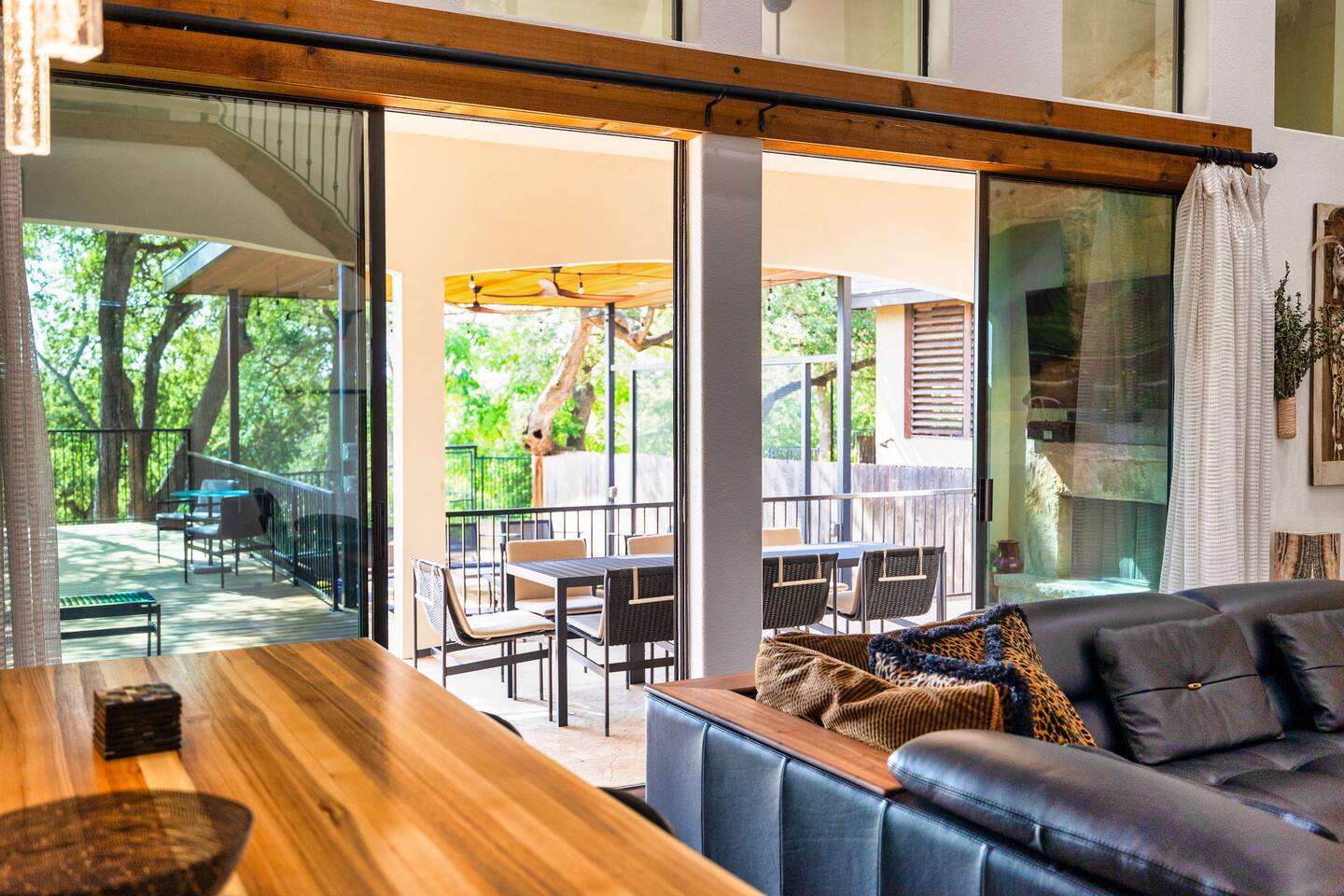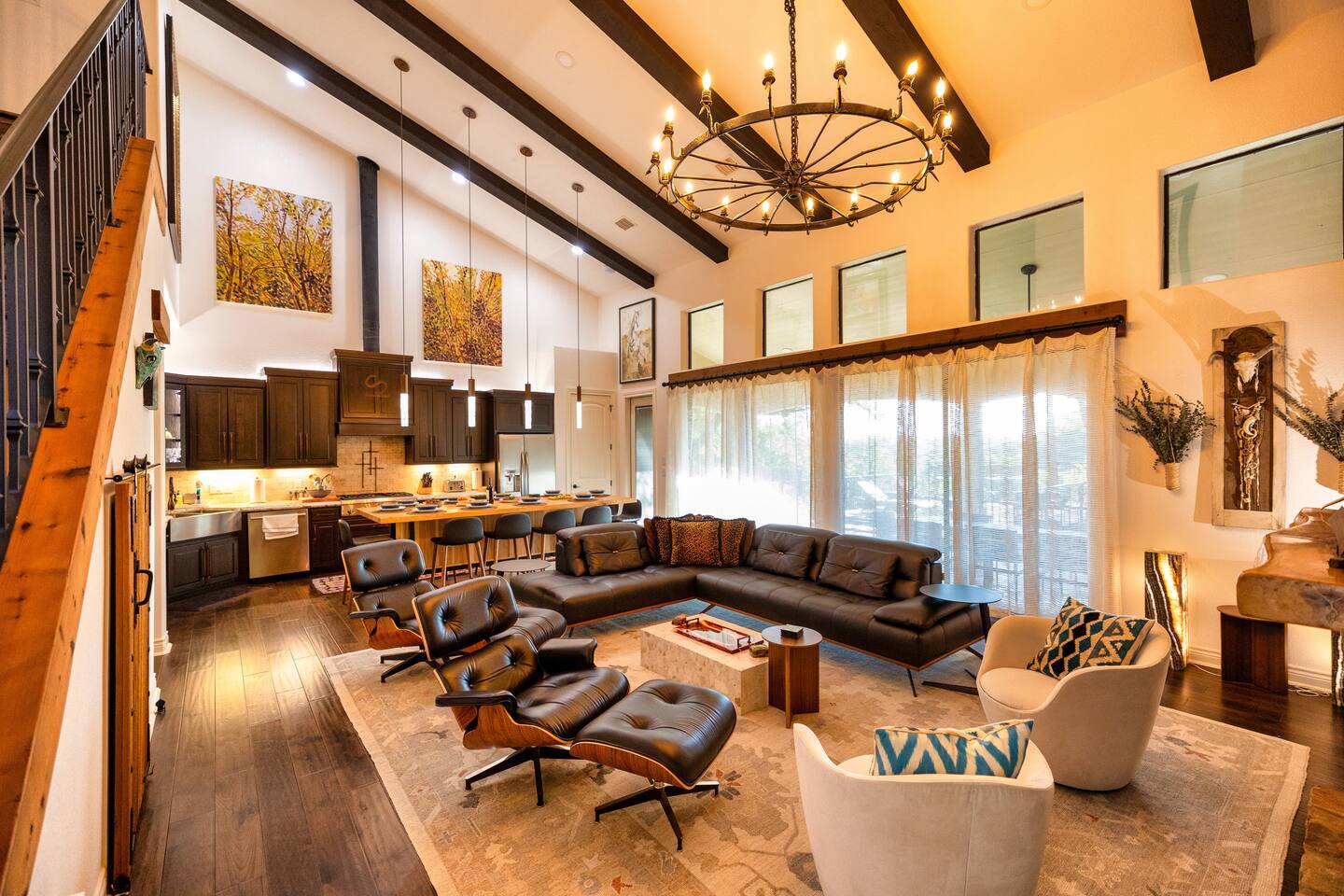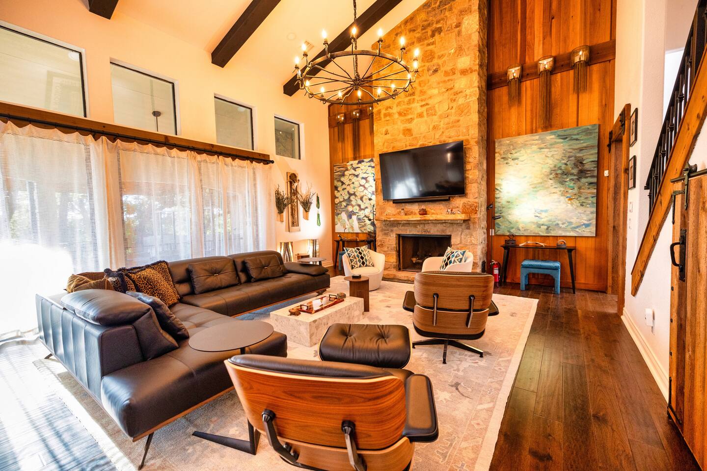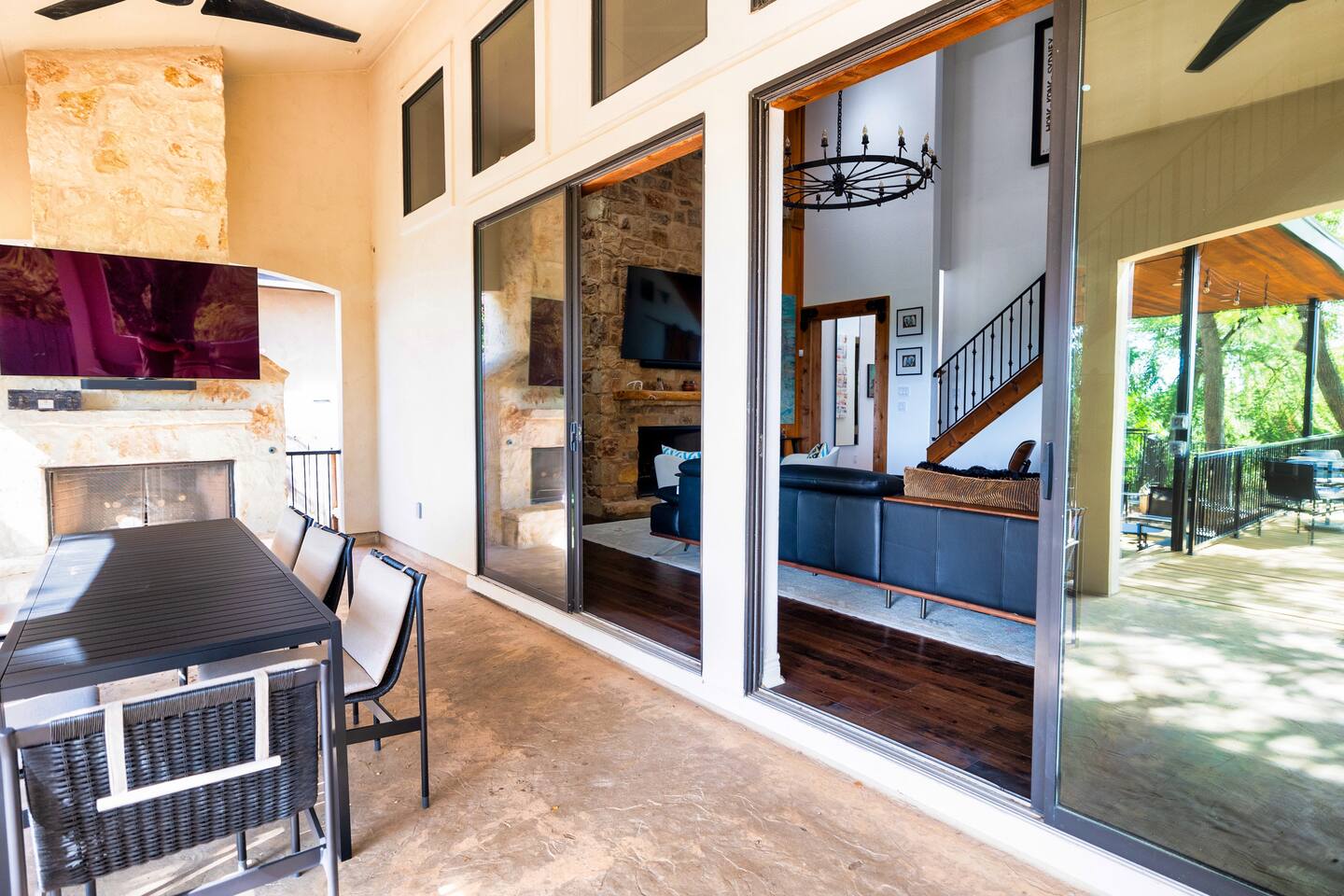 Welcome to the luxurious "Latigo" home nestled in New Bruanfels inside the historic district of Gruene! This 2100+ sqft 2 story home is decorated with one of a kind beautiful custom artwork and custom furniture. This is a 4 bedroom, 4.5 bathroom home located right on the Guadalupe river, and is walking distance to all the restaurants, bars, and music venues that Gruene has to offer. You are minutes away from the famous Gruene Hall where legends like Willie Nelson, George Strait, Merle Haggard , and countless others have graced the stage. One of the unique and convenient features of this home is that each bedroom has it's own dedicated full bathroom suite! LIVING ROOM The living room has original Eames chairs, Italian leather sofa, gas fire place, and large flat screen smart TV for your enjoyment and relaxation time. High vaulted ceilings and twin double glass sliding doors provide an open unrestricted tree top hill country view . KITCHEN Connected to the living room is the fully stocked, beautifully designed kitchen, which can easily seat 10 guests comfortably around the custom built pecan wood dining room table complete with leather dining room chairs. There are also beautiful Oriental rugs throughout the home. BACK PATIO Right off the kitchen and living room is the large, mostly covered back patio lounging area that has it's own outdoor kitchen, gas BBQ pit, sink, ice maker, and plenty of seating for all your guests to comfortable enjoy. This outdoor entertaining area also has a gas fire place, flat screen TV, and large dining table. You also have your own private staircase that leads directly down to the Guadalupe river! BEDROOMS We can comfortably sleep up to 10 guests. There are 2 bedrooms downstairs, and 2 upstairs. As mentioned before each bedroom has their own dedicated full bathroom attached. All the beds in the Latigo home are Tempur Pedic mattresses and dressed with 1000 thread count linens. 3 Bedrooms have king size beds, and one of the upstairs bedrooms has 2 Queens. Each bedroom has solid walnut designer bed frames and dressers. Each bathroom is fully stocked with plenty of towels and toiletries, and we have a washer and drier onsite for your laundry needs. PARKING: You have a private driveway and partially covered parking area attached to the driveway. You can park up to 5 vehicles comfortably. EV charging outlet available. This 50amp outlet located outside on the driveway by the front entry way is capable of charging your electric vehicle. Book this one of a kind luxurious river front home today for your next vacation or business trip. I promise you won't be disappointed!
