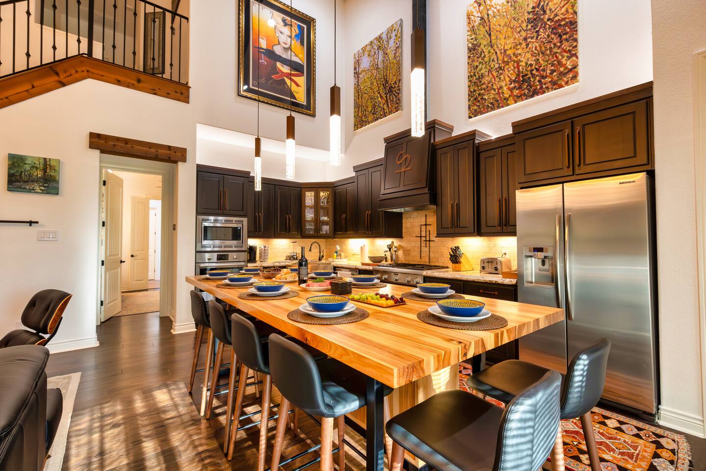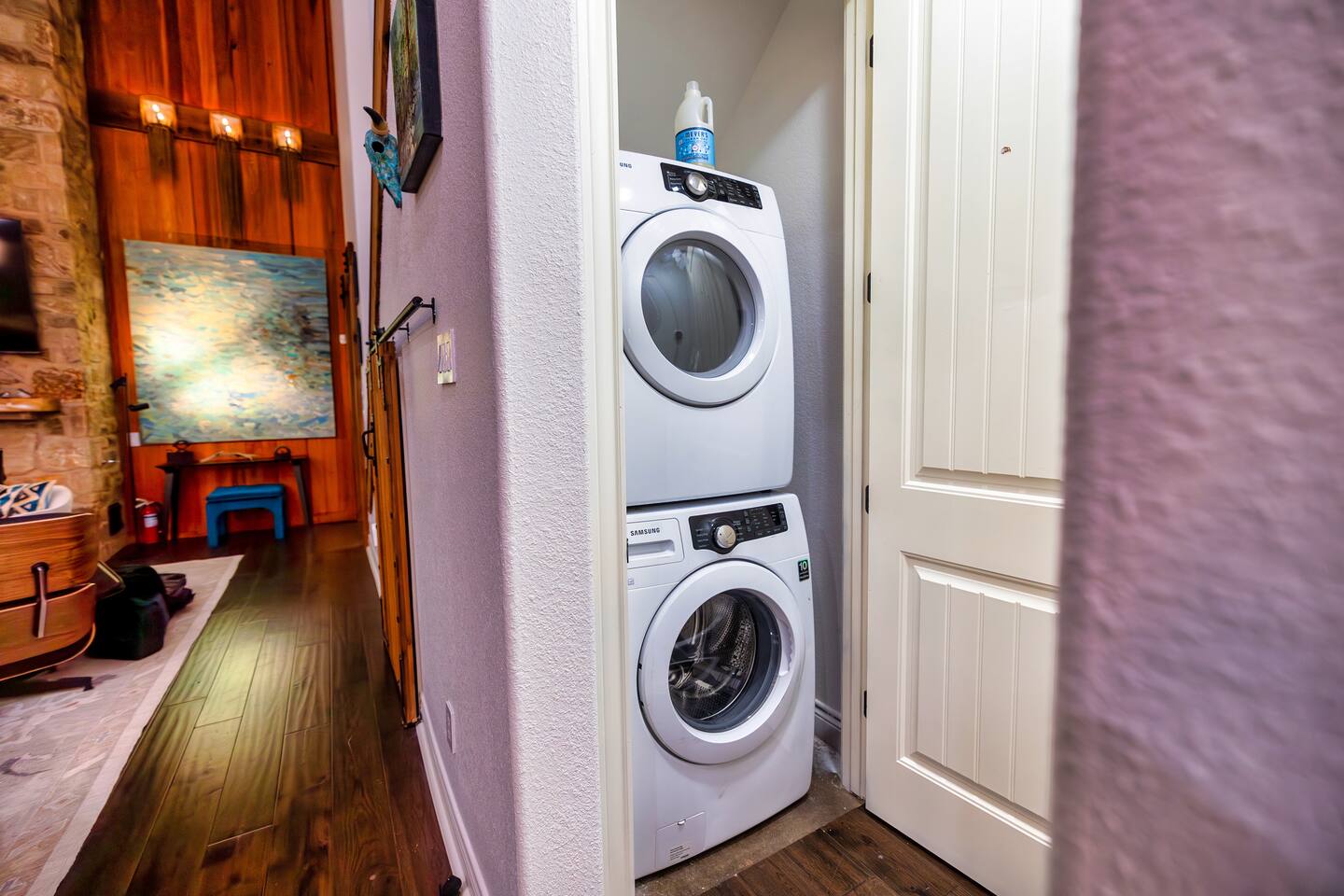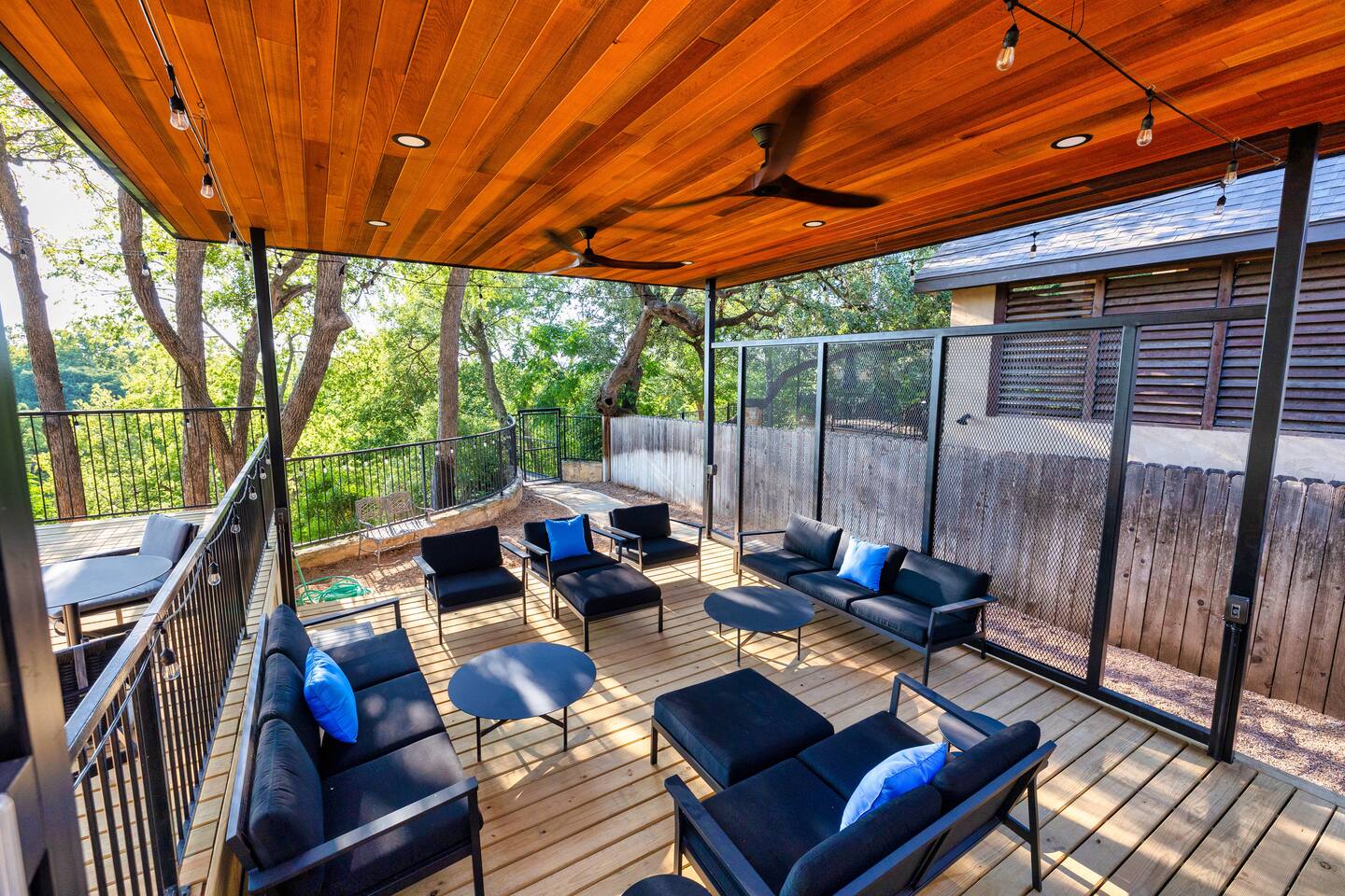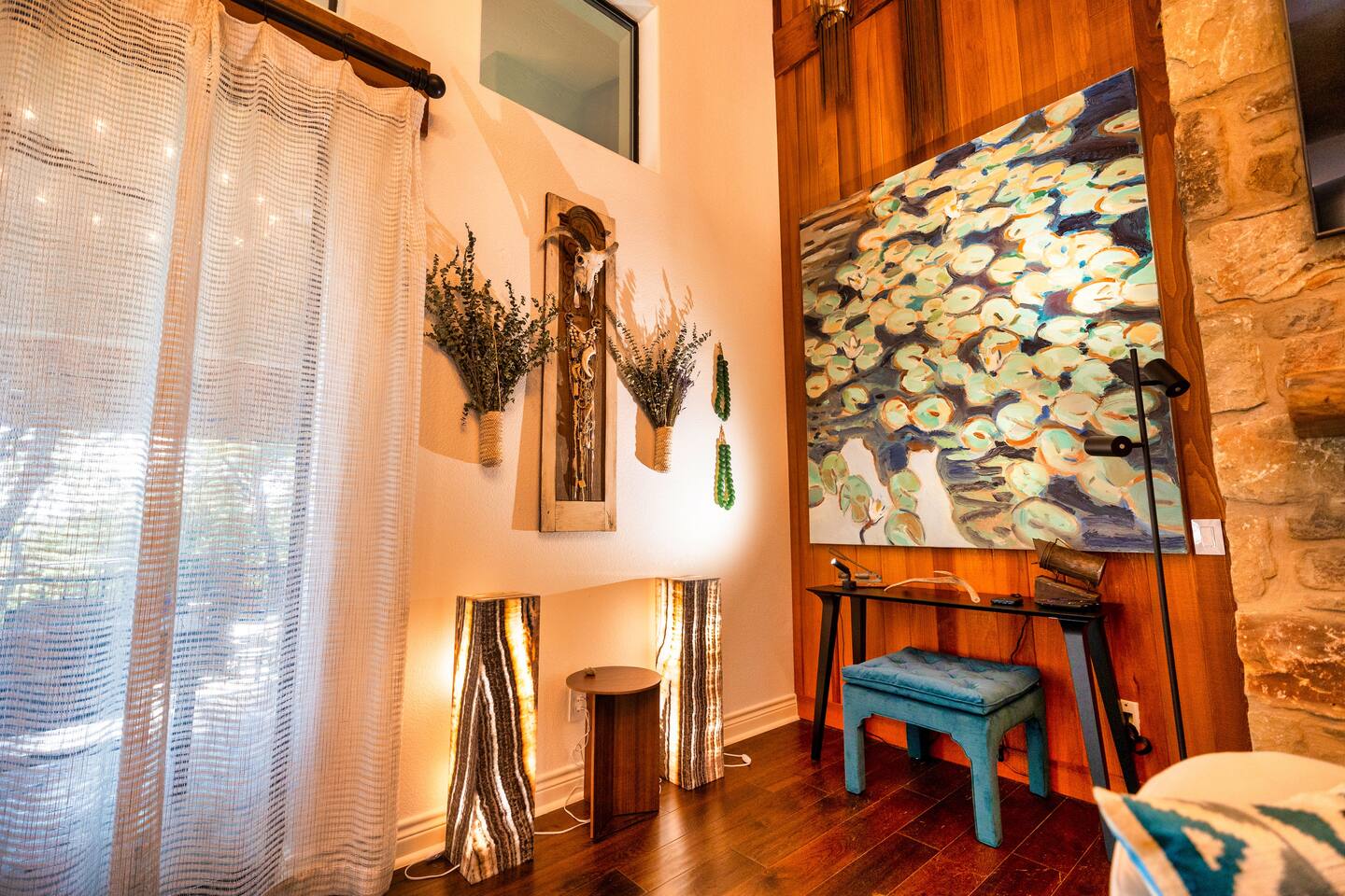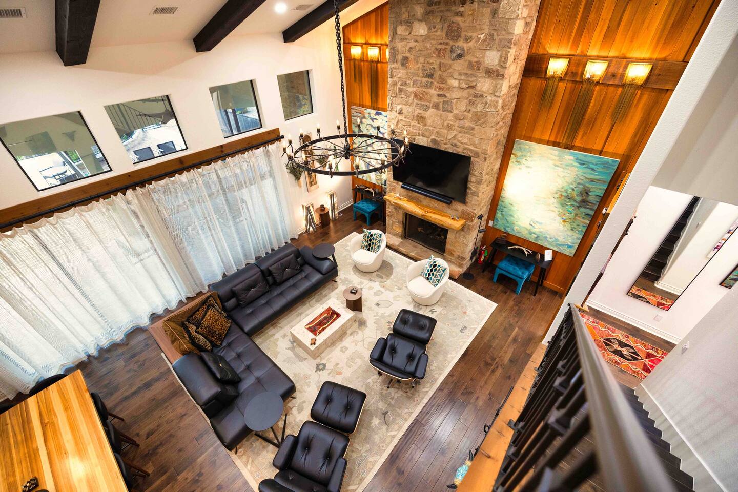 Welcome to the luxurious "Latigo" home nestled in New Bruanfels inside the historic district of Gruene! This 2100+ sqft 2 story home is decorated with one of a kind beautiful custom artwork and custom furniture. This is a 4 bedroom, 4.5 bathroom home located right on the Guadalupe river, and is walking distance to all the restaurants, bars, and music venues that Gruene has to offer. You are minutes away from the famous Gruene Hall where legends like Willie Nelson, George Strait, Merle Haggard , and countless others have graced the stage. One of the unique and convenient features of this home is that each bedroom has it's own dedicated full bathroom suite! LIVING ROOM The living room has original Eames chairs, Italian leather sofa, gas fire place, and large flat screen smart TV for your enjoyment and relaxation time. High vaulted ceilings and twin double glass sliding doors provide an open unrestricted tree top hill country view . KITCHEN Connected to the living room is the fully stocked, beautifully designed kitchen, which can easily seat 10 guests comfortably around the custom built pecan wood dining room table complete with leather dining room chairs. There are also beautiful Oriental rugs throughout the home. BACK PATIO Right off the kitchen and living room is the large, mostly covered back patio lounging area that has it's own outdoor kitchen, gas BBQ pit, sink, ice maker, and plenty of seating for all your guests to comfortable enjoy. This outdoor entertaining area also has a gas fire place, flat screen TV, and large dining table. You also have your own private staircase that leads directly down to the Guadalupe river! BEDROOMS We can comfortably sleep up to 10 guests. There are 2 bedrooms downstairs, and 2 upstairs. As mentioned before each bedroom has their own dedicated full bathroom attached. All the beds in the Latigo home are Tempur Pedic mattresses and dressed with 1000 thread count linens. 3 Bedrooms have king size beds, and one of the upstairs bedrooms has 2 Queens. Each bedroom has solid walnut designer bed frames and dressers. Each bathroom is fully stocked with plenty of towels and toiletries, and we have a washer and drier onsite for your laundry needs. PARKING: You have a private driveway and partially covered parking area attached to the driveway. You can park up to 5 vehicles comfortably. EV charging outlet available. This 50amp outlet located outside on the driveway by the front entry way is capable of charging your electric vehicle. Book this one of a kind luxurious river front home today for your next vacation or business trip. I promise you won't be disappointed!