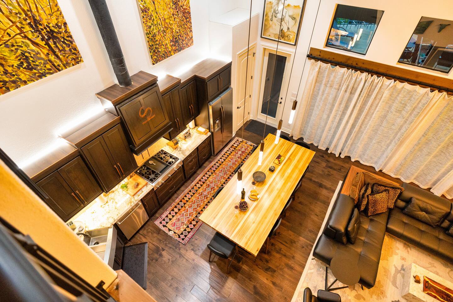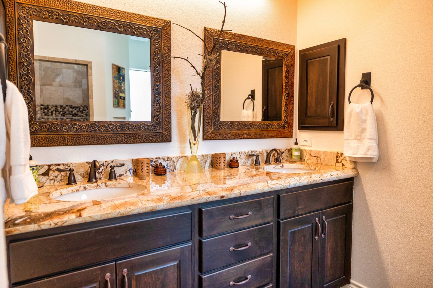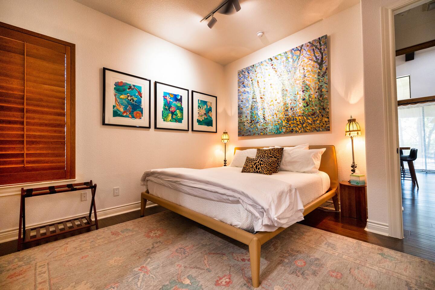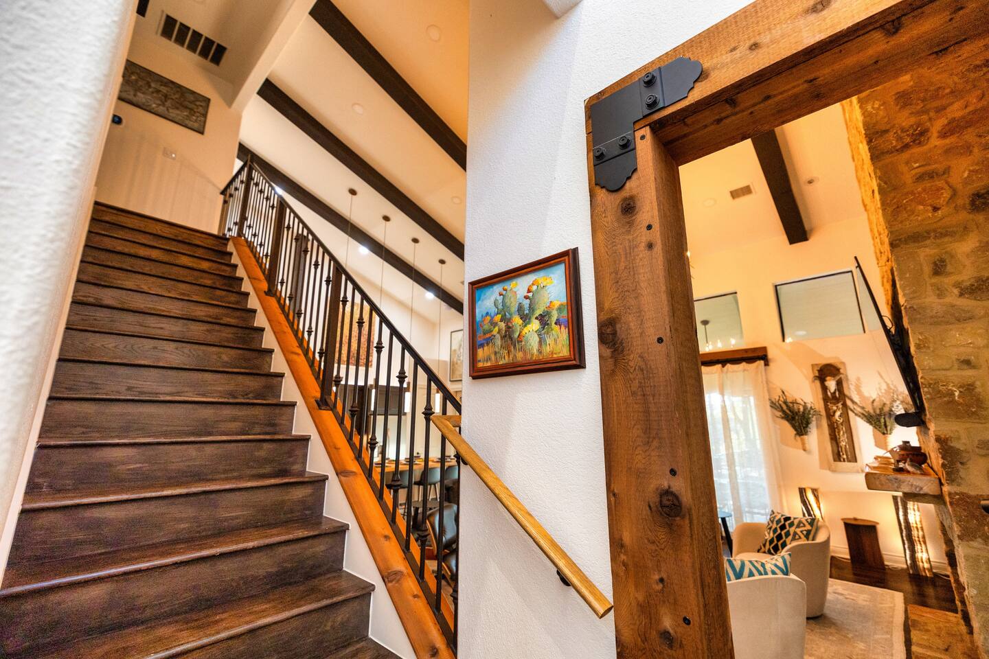 Welcome to the luxurious "Latigo" home nestled in New Bruanfels inside the historic district of Gruene! This 2100+ sqft 2 story home is decorated with one of a kind beautiful custom artwork and custom furniture. This is a 4 bedroom, 4.5 bathroom home located right on the Guadalupe river, and is walking distance to all the restaurants, bars, and music venues that Gruene has to offer. You are minutes away from the famous Gruene Hall where legends like Willie Nelson, George Strait, Merle Haggard , and countless others have graced the stage. One of the unique and convenient features of this home is that each bedroom has it's own dedicated full bathroom suite! LIVING ROOM The living room has original Eames chairs, Italian leather sofa, gas fire place, and large flat screen smart TV for your enjoyment and relaxation time. High vaulted ceilings and twin double glass sliding doors provide an open unrestricted tree top hill country view . KITCHEN Connected to the living room is the fully stocked, beautifully designed kitchen, which can easily seat 10 guests comfortably around the custom built pecan wood dining room table complete with leather dining room chairs. There are also beautiful Oriental rugs throughout the home. BACK PATIO Right off the kitchen and living room is the large, mostly covered back patio lounging area that has it's own outdoor kitchen, gas BBQ pit, sink, ice maker, and plenty of seating for all your guests to comfortable enjoy. This outdoor entertaining area also has a gas fire place, flat screen TV, and large dining table. You also have your own private staircase that leads directly down to the Guadalupe river! BEDROOMS We can comfortably sleep up to 10 guests. There are 2 bedrooms downstairs, and 2 upstairs. As mentioned before each bedroom has their own dedicated full bathroom attached. All the beds in the Latigo home are Tempur Pedic mattresses and dressed with 1000 thread count linens. 3 Bedrooms have king size beds, and one of the upstairs bedrooms has 2 Queens. Each bedroom has solid walnut designer bed frames and dressers. Each bathroom is fully stocked with plenty of towels and toiletries, and we have a washer and drier onsite for your laundry needs. PARKING: You have a private driveway and partially covered parking area attached to the driveway. You can park up to 5 vehicles comfortably. EV charging outlet available. This 50amp outlet located outside on the driveway by the front entry way is capable of charging your electric vehicle. Book this one of a kind luxurious river front home today for your next vacation or business trip. I promise you won't be disappointed!