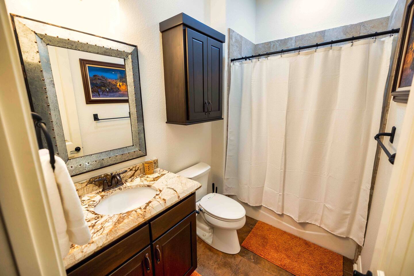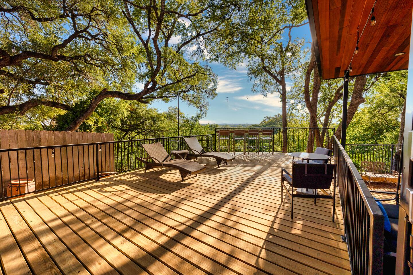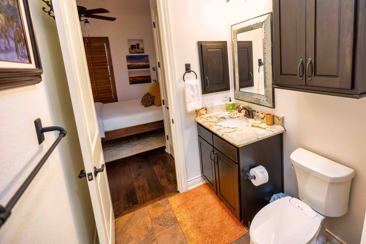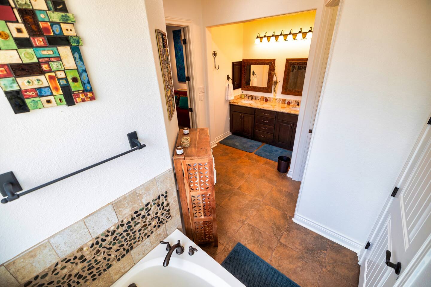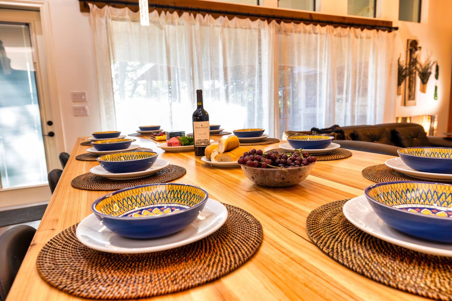 Welcome to the luxurious "Latigo" home nestled in New Bruanfels inside the historic district of Gruene! This 2100+ sqft 2 story home is decorated with one of a kind beautiful custom artwork and custom furniture. This is a 4 bedroom, 4.5 bathroom home located right on the Guadalupe river, and is walking distance to all the restaurants, bars, and music venues that Gruene has to offer. You are minutes away from the famous Gruene Hall where legends like Willie Nelson, George Strait, Merle Haggard , and countless others have graced the stage. One of the unique and convenient features of this home is that each bedroom has it's own dedicated full bathroom suite! LIVING ROOM The living room has original Eames chairs, Italian leather sofa, gas fire place, and large flat screen smart TV for your enjoyment and relaxation time. High vaulted ceilings and twin double glass sliding doors provide an open unrestricted tree top hill country view . KITCHEN Connected to the living room is the fully stocked, beautifully designed kitchen, which can easily seat 10 guests comfortably around the custom built pecan wood dining room table complete with leather dining room chairs. There are also beautiful Oriental rugs throughout the home. BACK PATIO Right off the kitchen and living room is the large, mostly covered back patio lounging area that has it's own outdoor kitchen, gas BBQ pit, sink, ice maker, and plenty of seating for all your guests to comfortable enjoy. This outdoor entertaining area also has a gas fire place, flat screen TV, and large dining table. You also have your own private staircase that leads directly down to the Guadalupe river! BEDROOMS We can comfortably sleep up to 10 guests. There are 2 bedrooms downstairs, and 2 upstairs. As mentioned before each bedroom has their own dedicated full bathroom attached. All the beds in the Latigo home are Tempur Pedic mattresses and dressed with 1000 thread count linens. 3 Bedrooms have king size beds, and one of the upstairs bedrooms has 2 Queens. Each bedroom has solid walnut designer bed frames and dressers. Each bathroom is fully stocked with plenty of towels and toiletries, and we have a washer and drier onsite for your laundry needs. PARKING: You have a private driveway and partially covered parking area attached to the driveway. You can park up to 5 vehicles comfortably. EV charging outlet available. This 50amp outlet located outside on the driveway by the front entry way is capable of charging your electric vehicle. Book this one of a kind luxurious river front home today for your next vacation or business trip. I promise you won't be disappointed!
