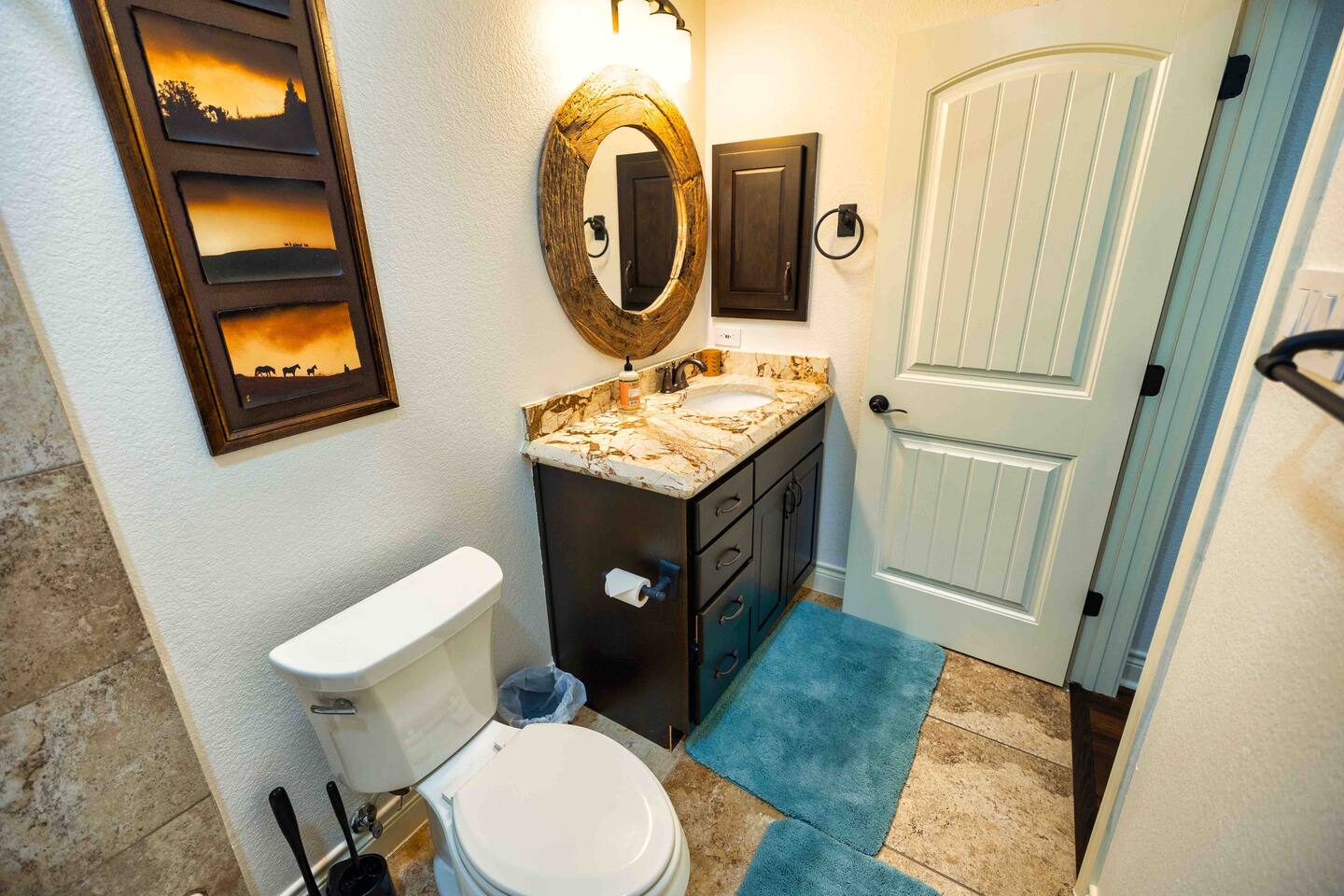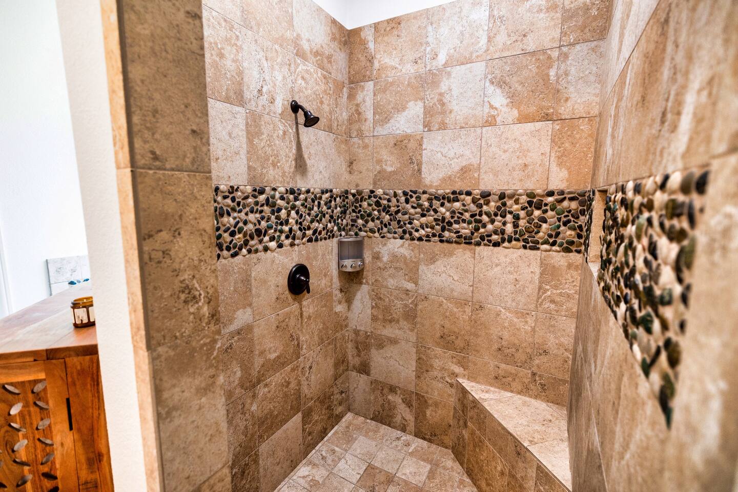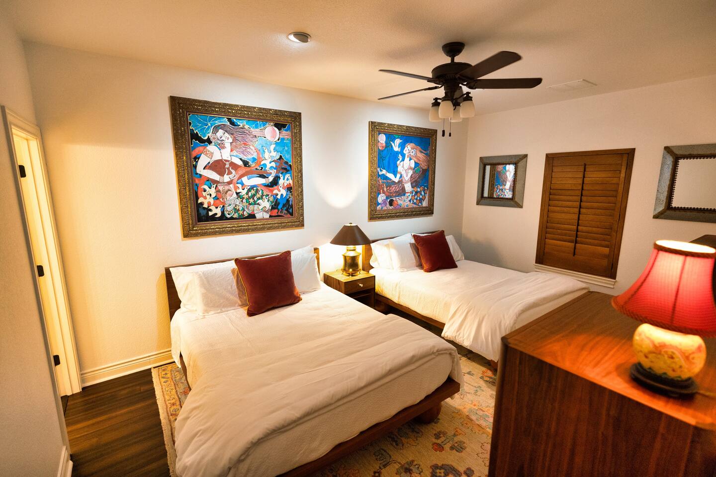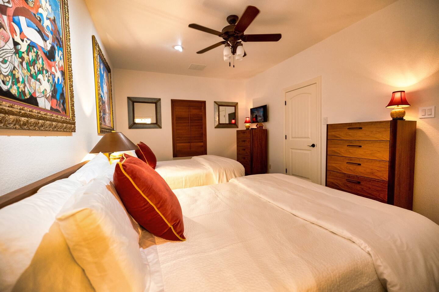 Welcome to the luxurious "Latigo" home nestled in New Bruanfels inside the historic district of Gruene! This 2100+ sqft 2 story home is decorated with one of a kind beautiful custom artwork and custom furniture. This is a 4 bedroom, 4.5 bathroom home located right on the Guadalupe river, and is walking distance to all the restaurants, bars, and music venues that Gruene has to offer. You are minutes away from the famous Gruene Hall where legends like Willie Nelson, George Strait, Merle Haggard , and countless others have graced the stage. One of the unique and convenient features of this home is that each bedroom has it's own dedicated full bathroom suite! LIVING ROOM The living room has original Eames chairs, Italian leather sofa, gas fire place, and large flat screen smart TV for your enjoyment and relaxation time. High vaulted ceilings and twin double glass sliding doors provide an open unrestricted tree top hill country view . KITCHEN Connected to the living room is the fully stocked, beautifully designed kitchen, which can easily seat 10 guests comfortably around the custom built pecan wood dining room table complete with leather dining room chairs. There are also beautiful Oriental rugs throughout the home. BACK PATIO Right off the kitchen and living room is the large, mostly covered back patio lounging area that has it's own outdoor kitchen, gas BBQ pit, sink, ice maker, and plenty of seating for all your guests to comfortable enjoy. This outdoor entertaining area also has a gas fire place, flat screen TV, and large dining table. You also have your own private staircase that leads directly down to the Guadalupe river! BEDROOMS We can comfortably sleep up to 10 guests. There are 2 bedrooms downstairs, and 2 upstairs. As mentioned before each bedroom has their own dedicated full bathroom attached. All the beds in the Latigo home are Tempur Pedic mattresses and dressed with 1000 thread count linens. 3 Bedrooms have king size beds, and one of the upstairs bedrooms has 2 Queens. Each bedroom has solid walnut designer bed frames and dressers. Each bathroom is fully stocked with plenty of towels and toiletries, and we have a washer and drier onsite for your laundry needs. PARKING: You have a private driveway and partially covered parking area attached to the driveway. You can park up to 5 vehicles comfortably. EV charging outlet available. This 50amp outlet located outside on the driveway by the front entry way is capable of charging your electric vehicle. Book this one of a kind luxurious river front home today for your next vacation or business trip. I promise you won't be disappointed!
